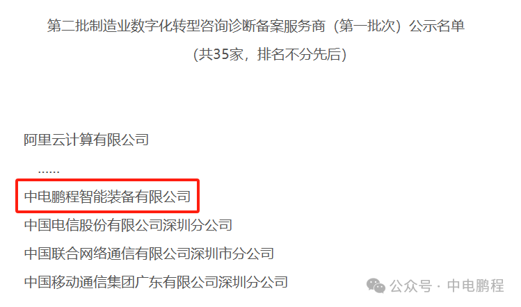 近日,深圳市工业和信息化局公布了《第二批制造业数字化转型咨询诊断服务商(第一批次)名单》,中电鹏程凭借在智改数转网联方面的突出技术实力和丰富项目经验,连续两年获批深圳市制造业数字化转型咨询诊断服务商。