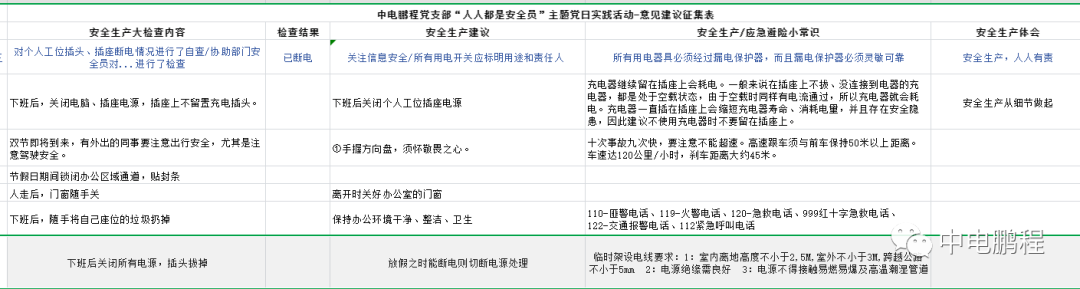 为贯彻落实习近平总书记关于安全生产的重要论述,践行“人民至上、生命至上、安全第一”的安全发展理念,强化安全意识、筑牢安全防线,中秋、国庆假日前夕,中电鹏程党支部组织开展了“人人都是安全员”主题实践活动。活动要求全体党员需在做好个人工位安全检查的基础上,积极配合安全员做好节前安全大检查。每名党员至少提一条安全生产建议、分享一条应急避险小知识、写一条安全生产体会。党支部将把相关意见、建议汇总后分享给安全办供参考。