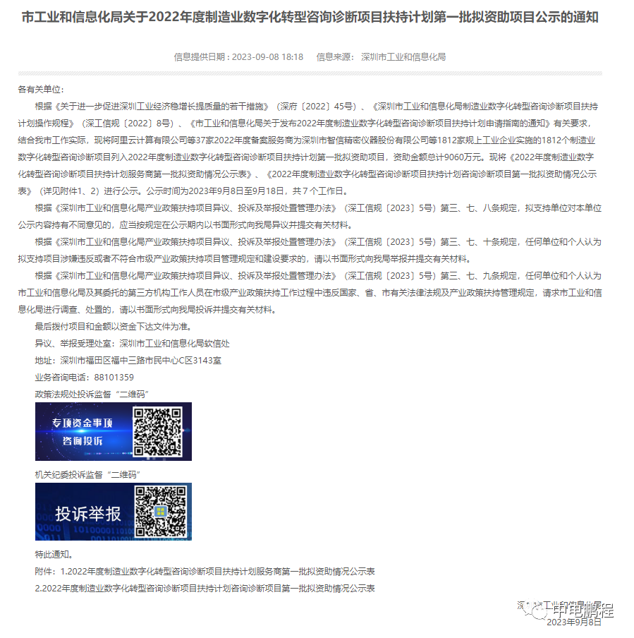 近日,深圳市工业和信息化局发布了《关于2022年度制造业数字化转型咨询诊断项目扶持计划第一批拟资助项目公示的通知》,明确将把中电鹏程等37家2022年度备案服务商为深圳市规上工业企业实施的制造业数字化转型咨询诊断项目列入2022年度制造业数字化转型咨询诊断项目扶持计划第一批资助项目。