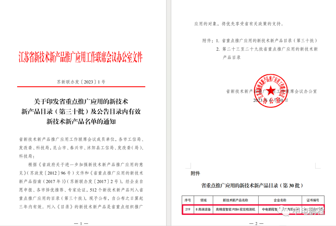 日前,江苏省新技术新产品推广应用工作联席会议办公室公布了第三十批省重点推广应用的新技术新产品目录名单。中电鹏程创新研发的高精度智能PCBA视觉检测机成功入选该名录,成为省重点组织推广应用的对象,将优先享受省有关政策的支持。
