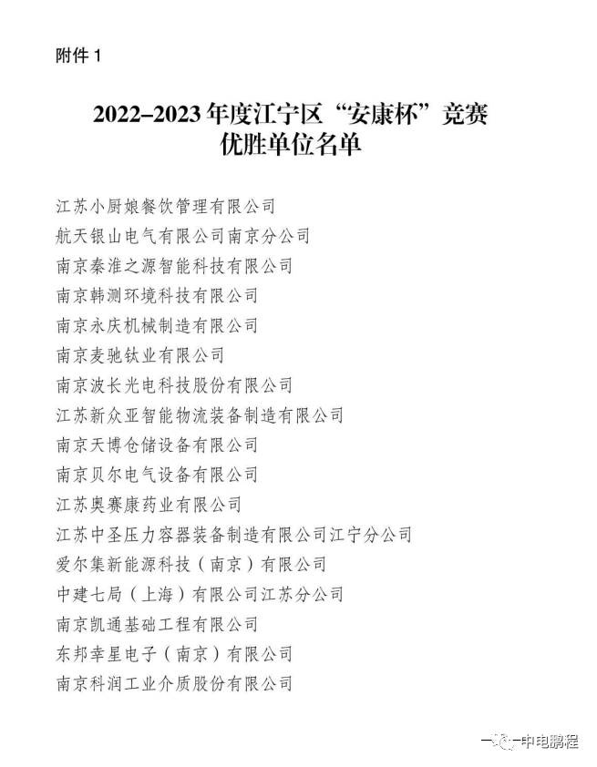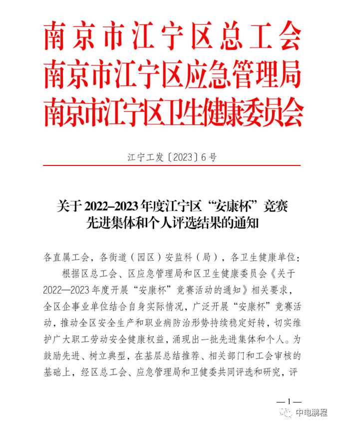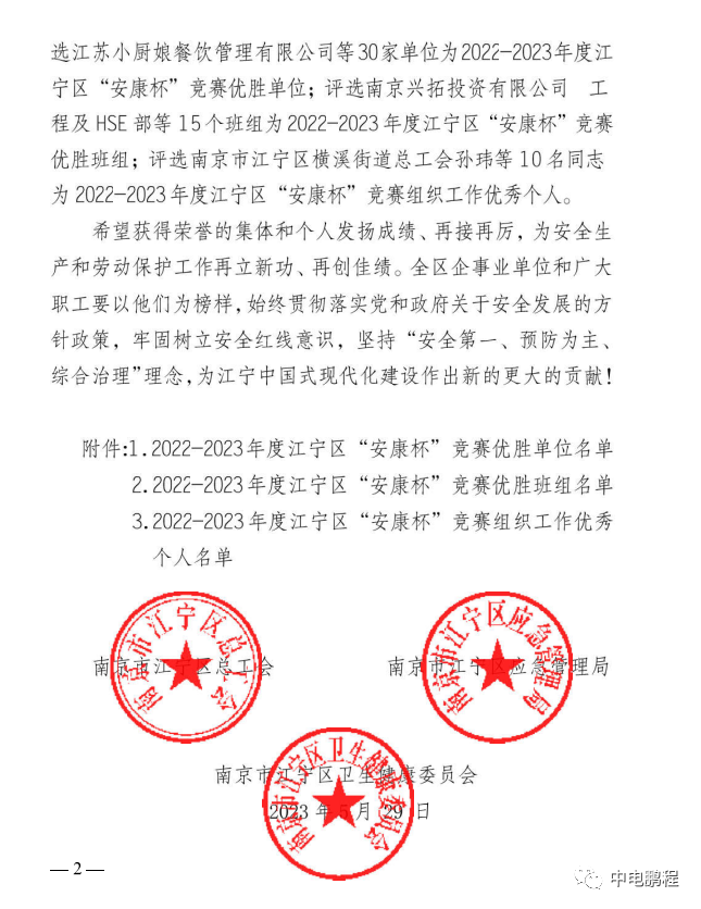 经过上级单位工作指导、公司精心组织安排和全体员工共同努力,成立三年来,中电鹏程各项安全生产工作有序推进,连续三年达成“六零六百”全年安全生产控制目标。5月29日,南京市江宁区总工会、南京市江宁区应急管理局、南京市江宁区卫生健康委员会联合发文表彰2022-2023年度江宁区“安康杯”竞赛先进集体和个人,凭借在安全生产管理工作上的优异表现,中电鹏程荣获2022-2023年度江宁区“安康杯”竞赛优胜单位。