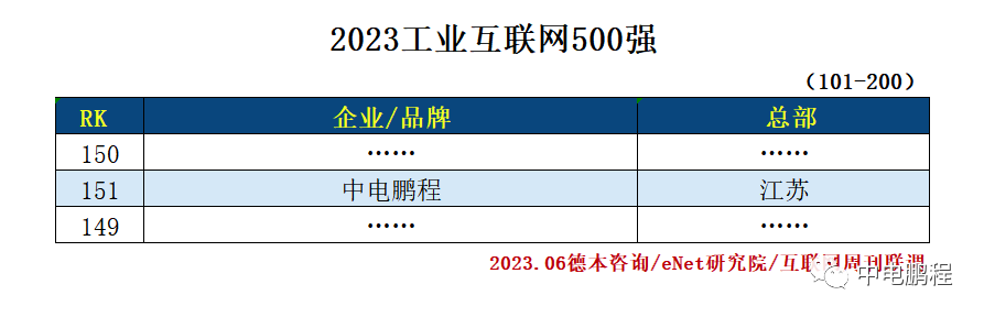 6月27日,《互联网周刊》联合eNET研究院、德本咨询发布了“2023工业互联网500强”名单,中电鹏程智能装备有限公司(简称中电鹏程)成功上榜,位列151名。