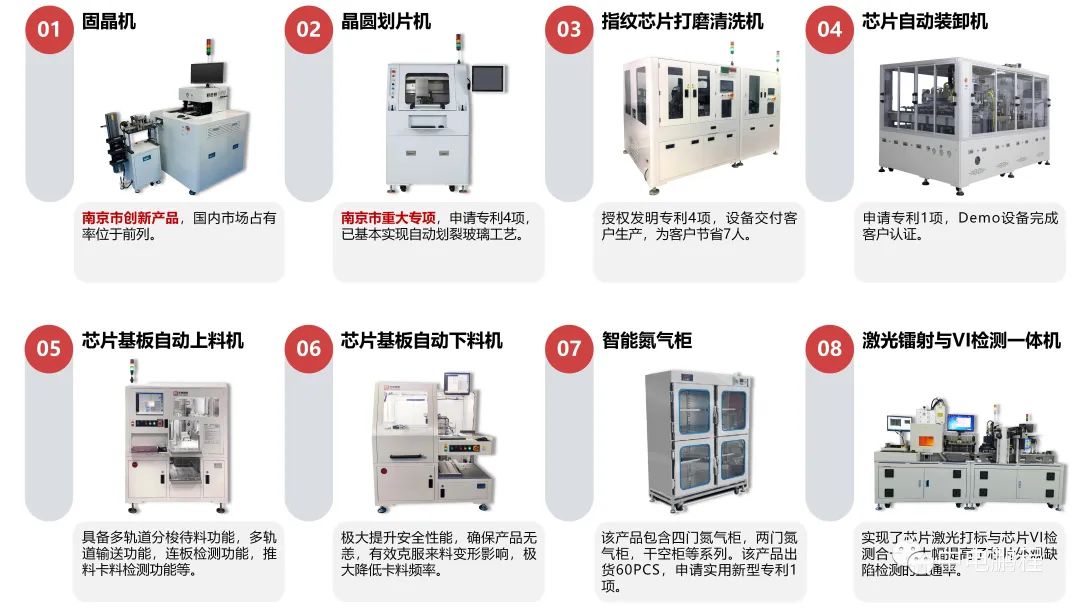 目前中电鹏程在第三代半导体方面,自主研发的核心产品包括第三代半导体划片机、固晶机、指纹芯片打磨清洗机、上下料及分选设备、弹夹上下料设备、叠层丝印机、Tray包装线以及氮气柜等工装治具与周边产品。