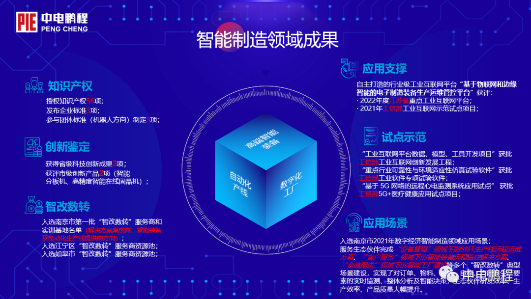 在制造企业的数字化转型、智能制造提升中,具有工业互联网属性智能核心装备的研发、迭代与创新便显得尤为关键与重要。中电鹏程作为中国电子EMS(电子制造服务)与半导体产业关键装备与成套系统产业化研制功能型总部,和中国电子支撑制造型企业数字化转型的骨干企业,自成立以来,坚持把国家重大战略需求放在首位,以国家政策、中国电子规划部署和市场需求为导向,依托深耕智能制造领域二十多年的技术优势与经验积累,立足电子信息制造、新型显示制造、半导体/集成电路制造等行业领域,以打造数字化转型领域行业领航标杆为目标,以“智能装备+工业互联网”为技术方向,坚持自主创新与联合创新相结合,向企业提供高端智能制造装备、自动化产线、数字工厂整体解决方案、智能制造咨询等产品与服务。并在此基础上,协同生态伙伴,开展设备规模接入、共性机理模型与微服务开发、工业APP创新等工业互联网平台能力提升与应用,全方位推动制造资源和生产能力的集成整合、在线分享和优化配置,构建智能制造服务生态闭环,打造可复制、可推广的网络化协同制造新模式新业态,推动制造企业智能化改造数字化转型。