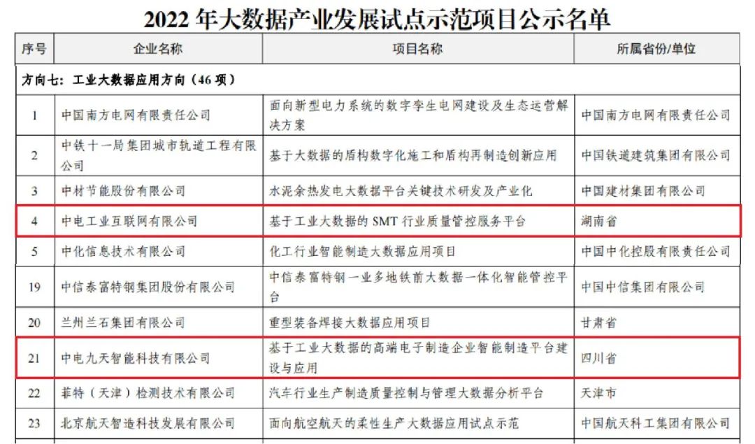 近日,工业和信息化部公布了2022年大数据产业发展试点示范项目名单。中电工业互联网有限公司(简称中电互联)打造的“基于工业大数据的SMT行业质量管控服务平台”以及下属企业中电九天智能科技有限公司(简称中电九天)打造的“基于工业大数据的高端电子制造企业智能制造平台建设与应用”等两个项目成功获批2022年大数据产业发展试点示范项目。本次评选是工信部针对当前大数据产业发展情况作出的权威认定,代表了中国大数据产业项目的较高水准。