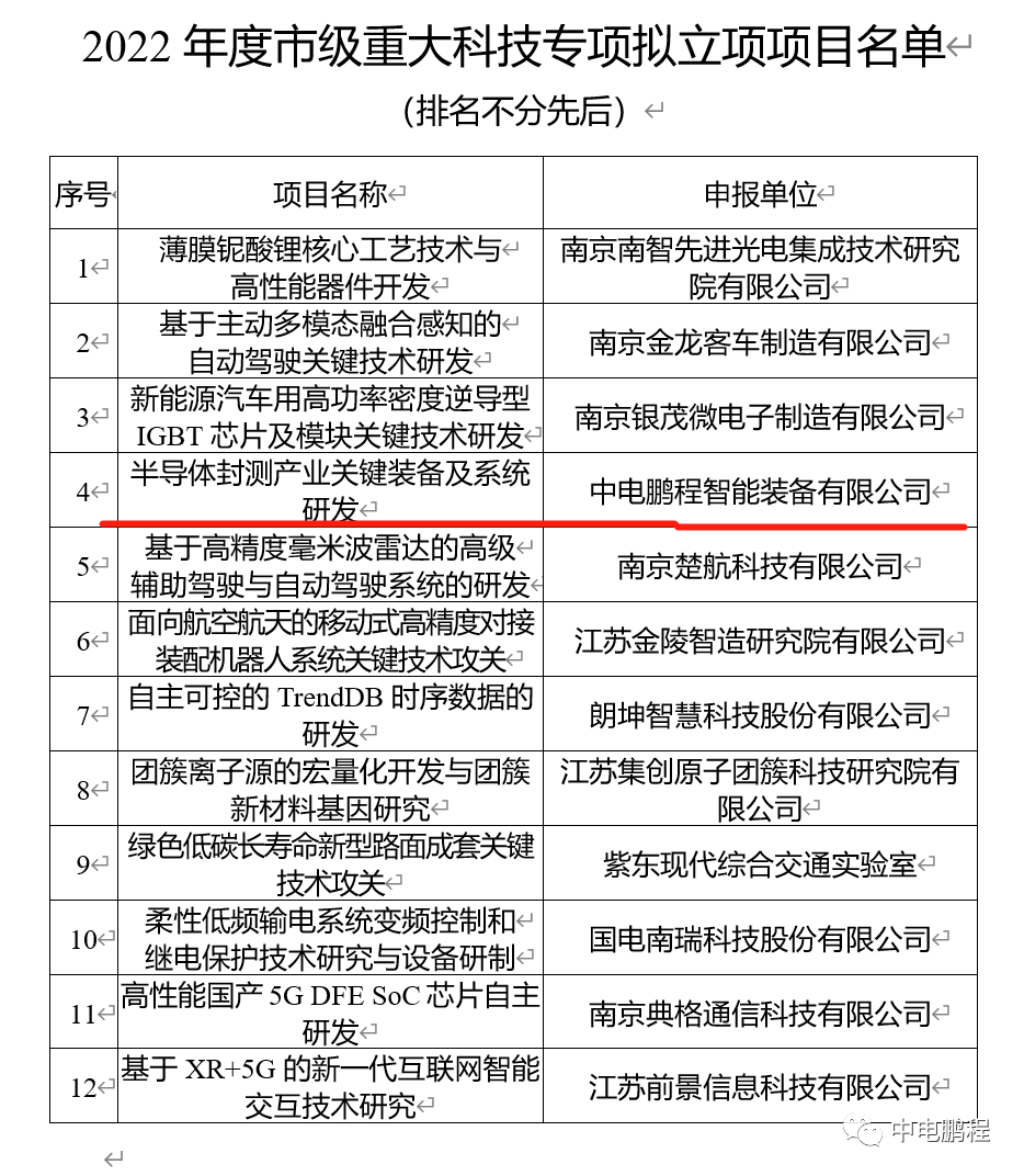 近日,南京市科学技术局公布了2022年度市级重大科技专项立项项目名单,中电鹏程牵头打造的关键技术攻关项目“半导体封测产业关键装备及系统研发(智能制造与装备方向)”获批立项。