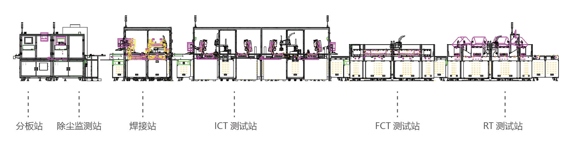 • 应用于医疗行业用PCB后段的生产和检测。首先将SMT线流下的整版PCB进行分割,除尘和边缘检测处理,之后焊接电源线,电池等元器件,最后进行PCB的ICT,FCT,RF 测试。